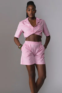 Linda ruffle waist shorts in organic Bubble Gum pink