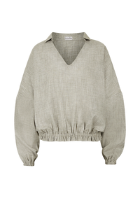 Boxy blouse with elasticated waist, featuring a shirt-style collar and long sleeves with a gentle puff.