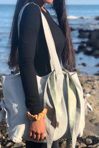 This bag is masterfully dyed under the supervision of Meena with natural nelli. Match it with the nelli grey scrunchie, scarf or jewellery if you love this classic and timeless shade.
