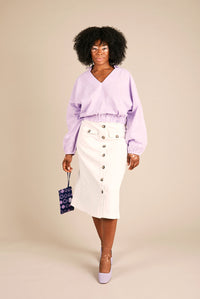 Boxy blouse with elasticated waist, featuring a shirt-style collar and long sleeves with a gentle puff.